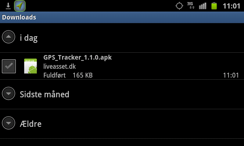 Kør filen efter download (på galaxy tablets skal du klikke på uret nederst i højre hjørne og i fremkomne menu klikke på den downloaded fil. På andre enheder vises ofte en download manager som nedenstående – tryk da blot på filnavenet og følg den fremkomne vejledning.