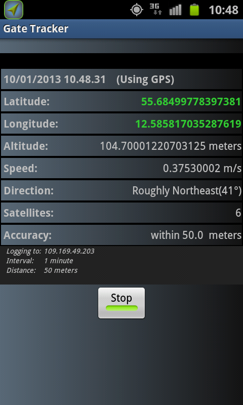 Placer enheden et sted hvor der kan opnås GPS satalit forbindelse (i vindue / udenfor) og tryk derefter på knappen knappen ‘Start’  (skal have grønt lys i lampen) og øverste sektion skal være udfyldt med gpskoordinator som følger: