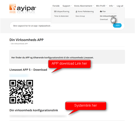 2. Noter dig fra helpdesk menuen til “Din virksomheds APP” download link/QR kode & jeres systemlink