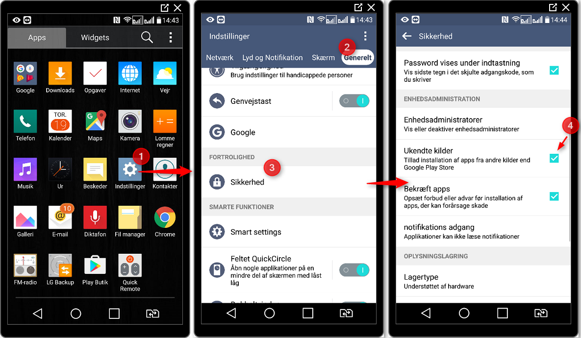 1. Konfigurer én gang for alle din smartphone/tablet til at tillade installation fra ‘Ukendte Kilder’