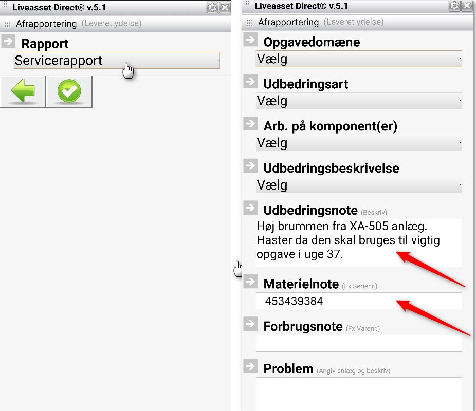 9. Vælg så punktet ‘Servicerapport’ i drop down og udfyld de 2 felter ‘Udbedringsnote’ og ‘Materielnote’