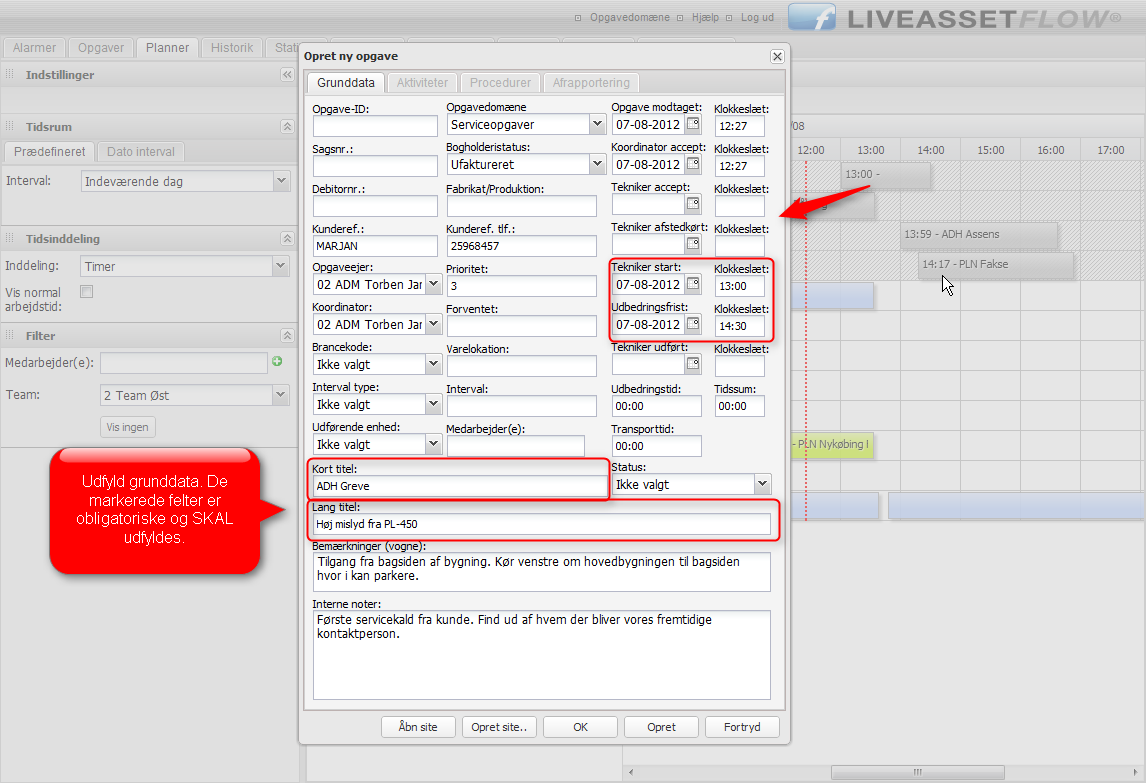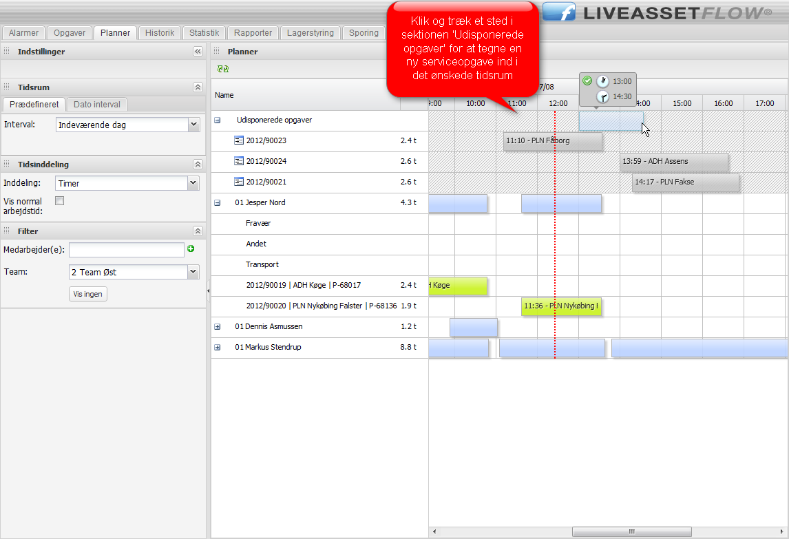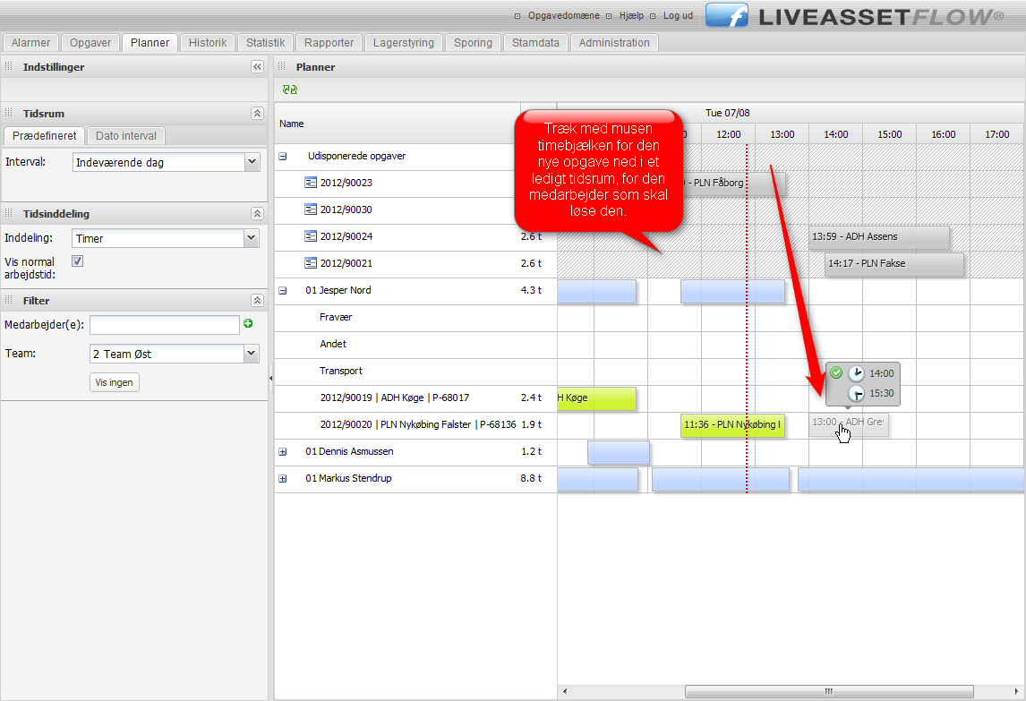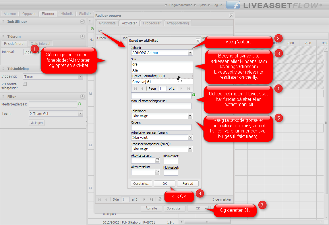 1. Tegn opgaven ind på den grafiske tidslinje 2. Udfyld Grunddata 3. Opret en aktivitet på opgaven 4. Træk timebjælken ned på den ønskede medarbejder 5. Accepter opgaven på den mobile computer i marken