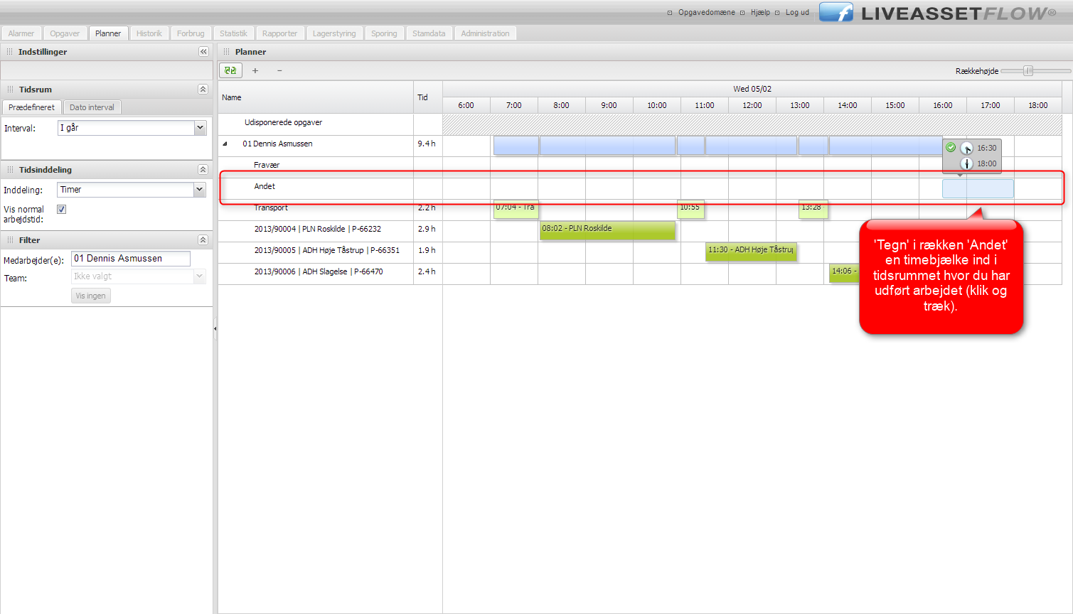 1. Tegn med musen en timebjælke ind i ‘Andet’ rækken