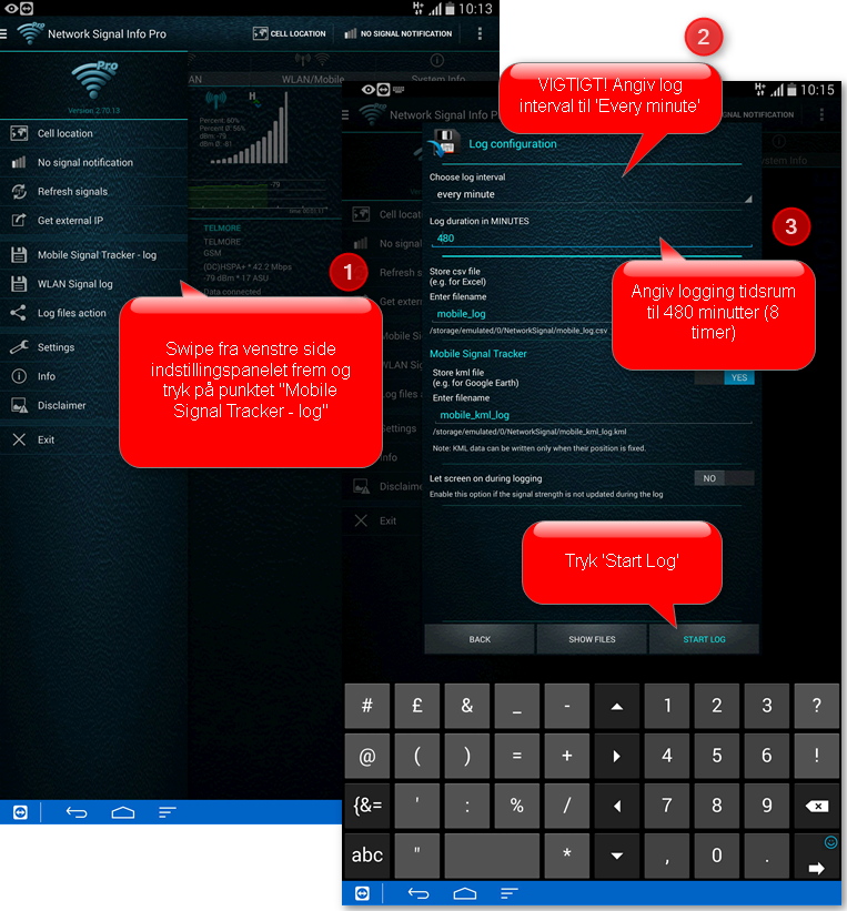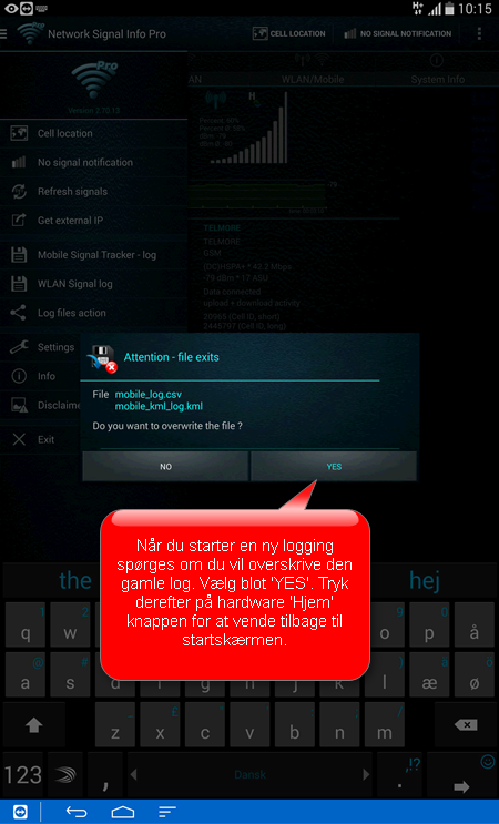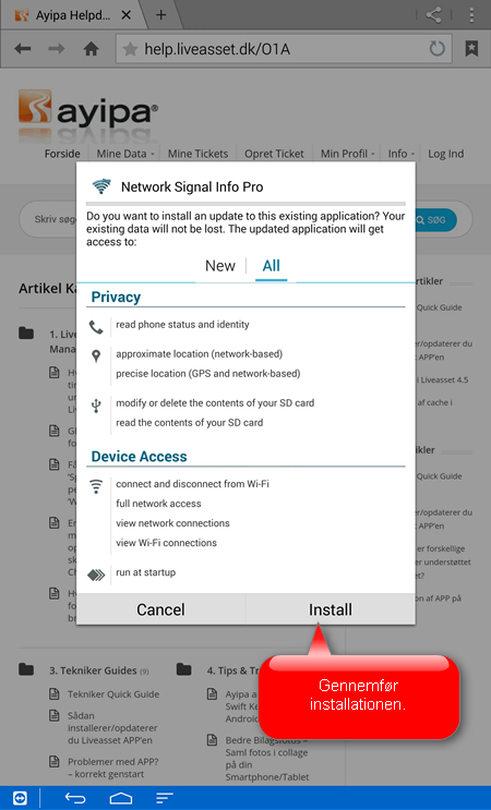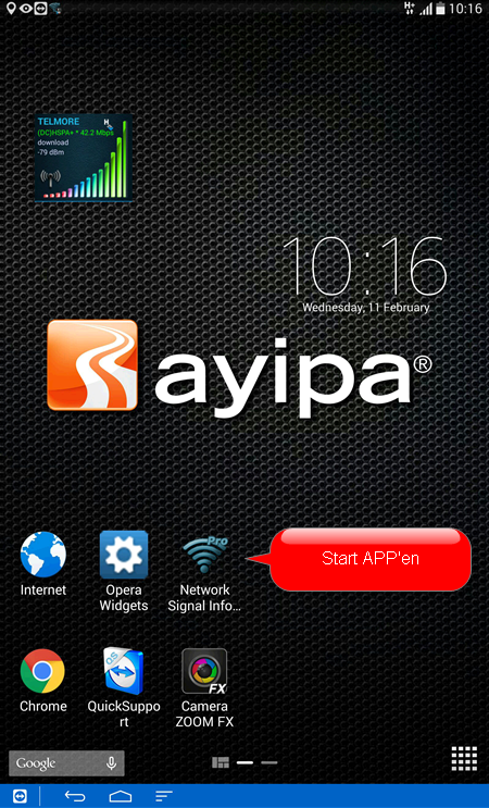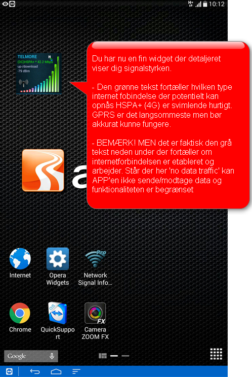 Oplever du problemer med APP’en skyldes det ofte udfald på netforbindelsen. I den forbindelse kan det være en hjælp at installere en APP’en “Network Signal Info” der gør det nemmere at aflæse og monitorere præcis hvad der foregår på din enhed.