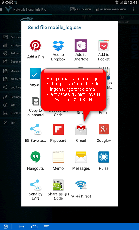 Hvis du ved e-mail er sat op og fungerer på din enhed bedes du blot via APP’en sende logfilen som vist på skærmbilledet nedenfor.Loggen sendes til infodesk@ayipa.com